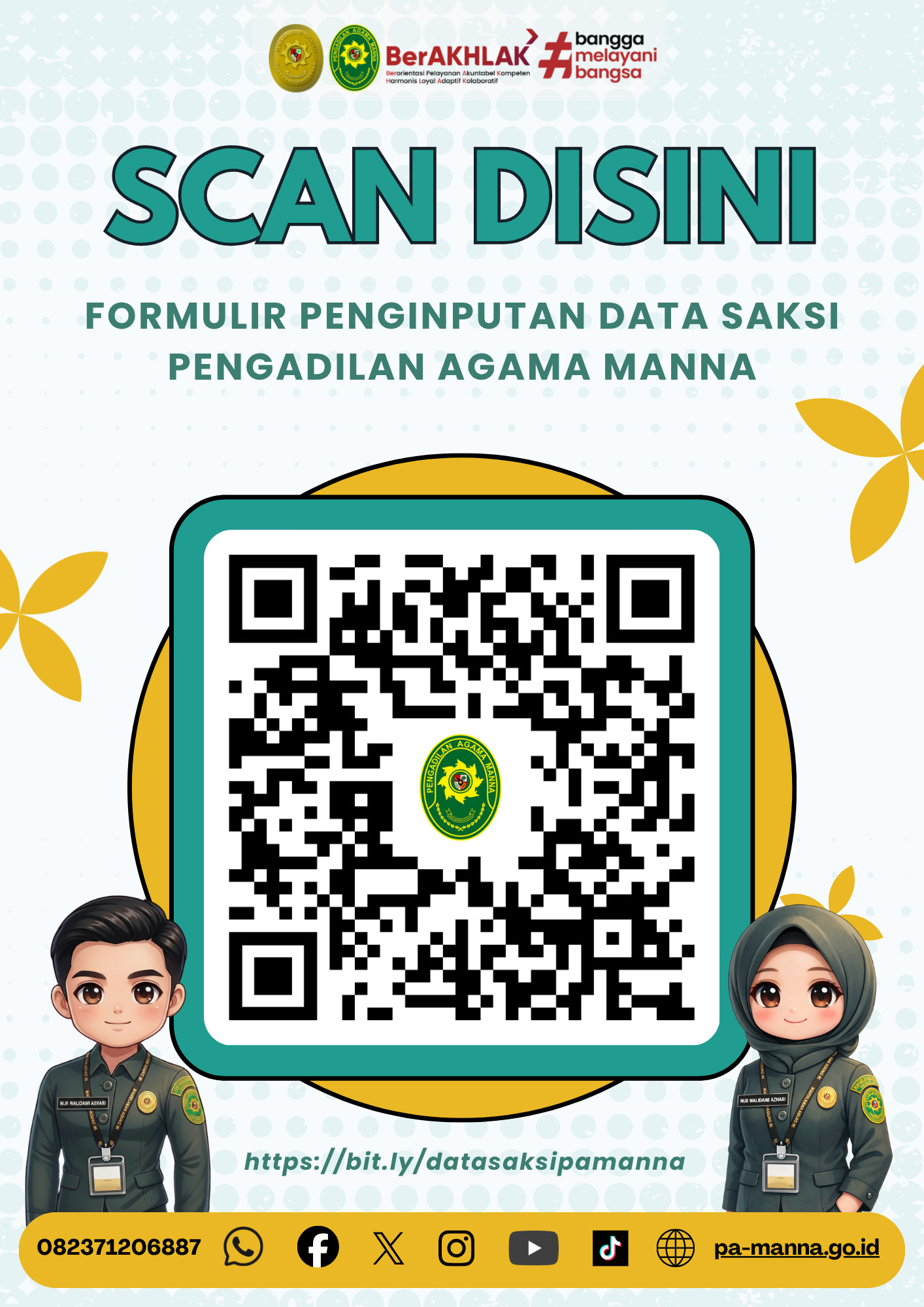 Misalnya saja pada hari Selasa, 16 Oktober 2018 selepas shalat ashar, Keluarga Besar Pengadilan Agama Manna melakukan 2 kunjungan sekaligus yaitu pertama kunjungan ke rumah Kasvina Melzai, S.H.I (Panitera Pengganti PA Manna) yang baru saja melahirkan anak ketiganya yang diberi nama Ali Ar Rayyan. Keluarga Besar PA Manna mengucapkan selamat atas lahirnya anak ketiga yang merupakan putra pertamanya. Harapan kita bersama semoga menjadi anak yang soleh dan berbakti untuk agama, bangsa dan negara.