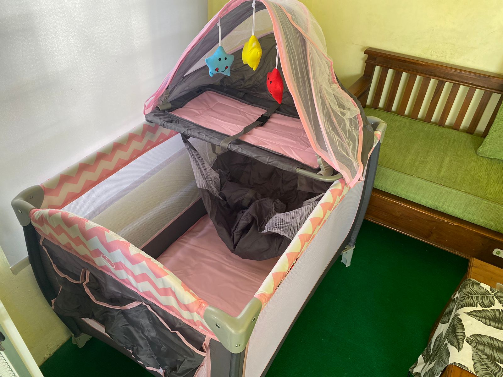 Kehadiran tempat tidur bayi multifungsi ini merupakan peningkatan signifikan dalam kenyamanan bagi para ibu yang berurusan dengan membawa buah hati. Fasilitas ini dirancang untuk memiliki fungsi ganda yang sangat praktis. Pertama, tempat tidur ini berfungsi sebagai tempat tidur nyaman yang aman, sehingga bayi dapat beristirahat dengan tenang dan terlindungi oleh kelambu. Kedua, tempat tidur ini juga bertindak sebagai meja ganti popok (diaper changing station) yang higienis, sebab bagian atas tempat tidur didesain khusus agar dapat digunakan sebagai area yang mudah dan bersih untuk mengganti popok bayi. Dengan fungsi ganda ini, kebutuhan istirahat dan kebersihan bayi dapat terpenuhi secara optimal di satu tempat.